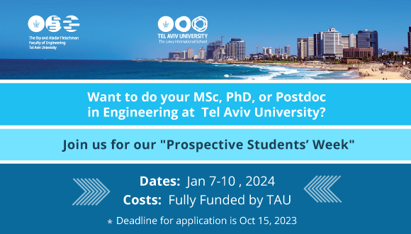 שבוע סטודנטים פוטנציאליים PROSPECTIVE STUDENTS WEEK- הפקולטה להנדסה יזמה את שבוע הסטודנטים הפוטנציאליים הראשון שלה אי פעם במטרה לעודד מועמדים בינלאומיים מצוינים לתארים מתקדמים או לפוסט דוקטורט להמשיך את לימודיהם בפקולטה להנדסה באוניברסיטת תל אביב. ביקור זה ימומן על ידי הפקולטה להנדסה, ומשרד סגנית הנשיא לבינלאומיות.